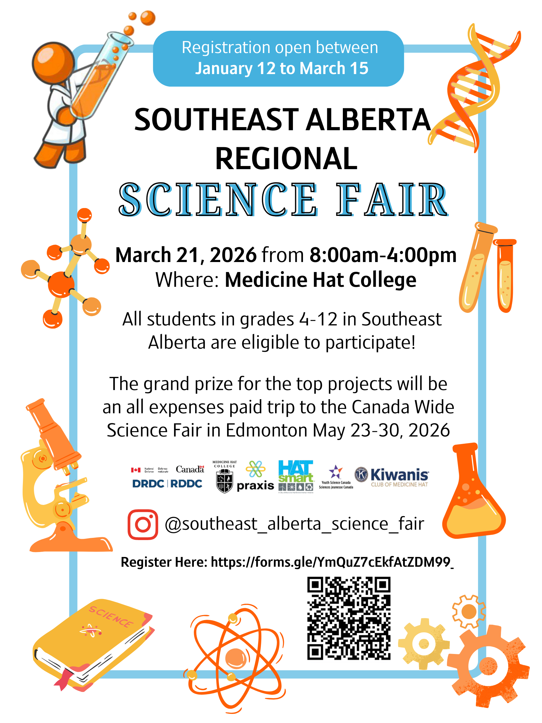 The Regional Science Fair is held in Medicine Hat and takes place in late March. Check back here for the 2026 fair information. Students from schools across our region compete at the elementary (grades 4-6), junior (grades 7-8), intermediate (grades 9-10), and senior (grades 11-12) levels. Participants in all grade categories are eligible to win certificates, prizes, and special awards. Judging is provided by scientists, engineers, and other professionals under the supervision of the Chief Judge.